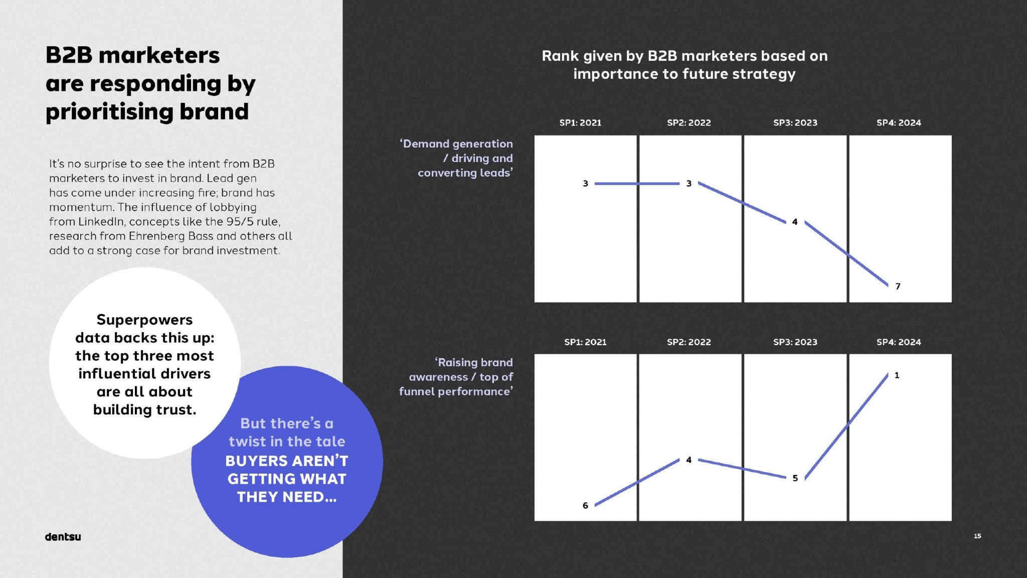 最后,B2B营销人员需要找到自己独特的声音:2/3的买家(68%)表示,他们在工作中看到的品牌声音和行为都是一样的,高于去年的63%和2022年的60%。