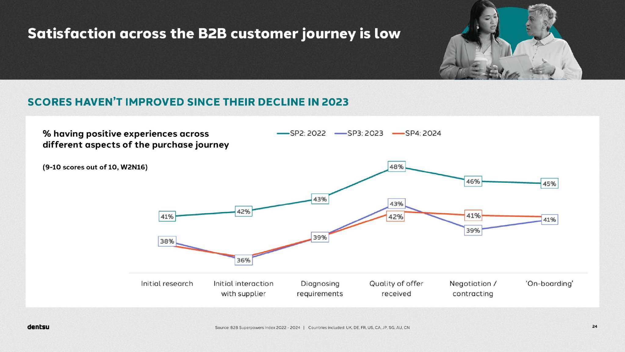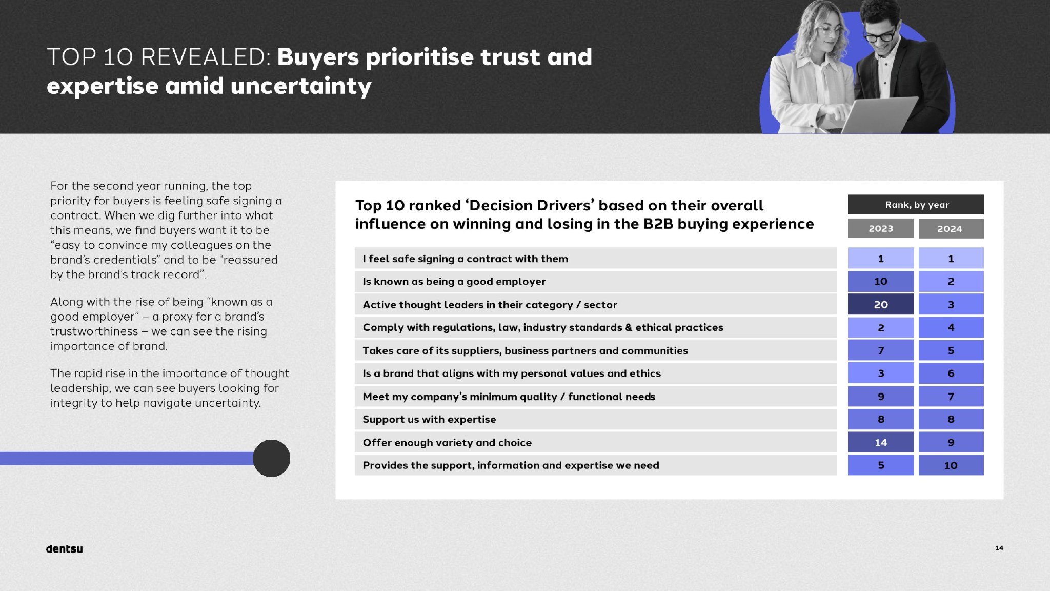 根据2024年Dentsu B2B超级大国指数,个人决策驱动因素在B2B买家中的重要性首次超过了专业决策驱动因素。该研究报告分析了自2021年以来全球超过25,000个B2B品牌的体验,显示个人安全和价值一致性等因素现在超过了传统的专业考虑因素,包括定价和产品功能。