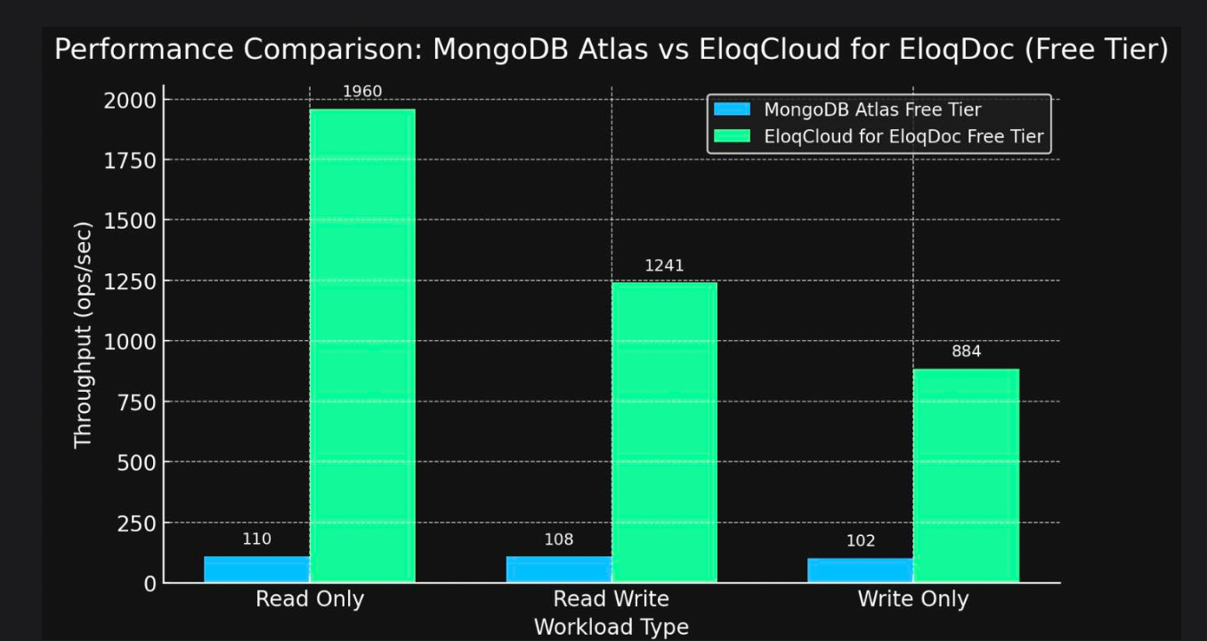 下图展示了 MongoDB Atlas 和 EloqCloud for EloqDoc(Free Tier)在三种典型工作负载下的性能对比: