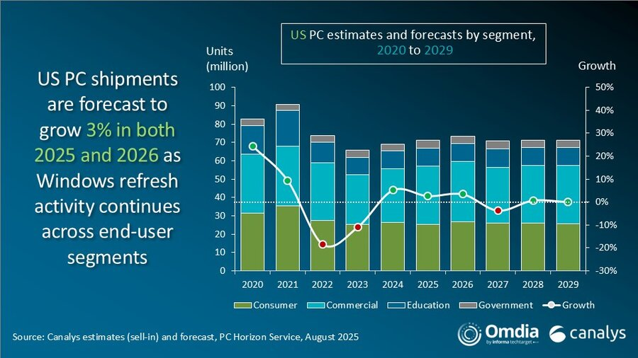 Canalys(隶属于Omdia)的最新研究显示,2025年第二季度,美国的PC出货量(不包括平板电脑)停滞不前,同比下降1.4%,至1860万台。这一疲软表现的背景是,供应商正在努力克服今年早些时候发货量增加造成的高库存水平,以限制预期关税带来的风险。尽管如此,预计2025年和2026年将有3%的温和增长,主要是受Windows 11持续过渡的推动。