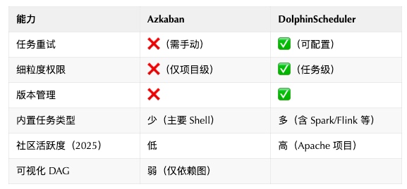 Azkaban 的权限模型只有“项目级别”的读写权限,无法做到“用户A只能编辑任务X,不能动任务Y”。在多团队共用一个调度平台时,权限混乱导致误操作频发。