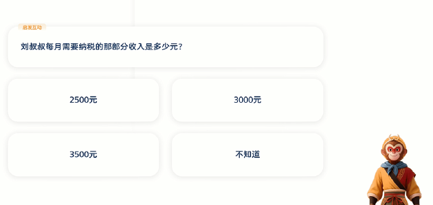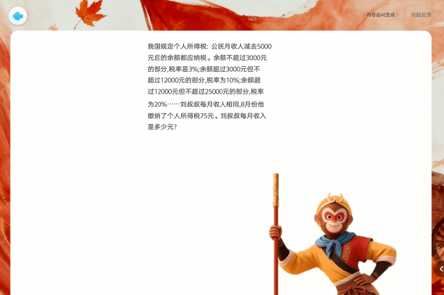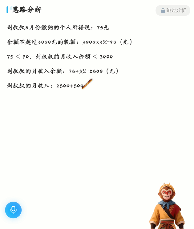 以上面这道小学算术题为例:题目要求计算刘叔叔的月收入,已知他8月份缴纳个人所得税75元,且“余额不超过3000元的部分,税率为3%”。AI大咖老师会先引导孩子理解题意——由第一档最高纳税额为90元,而实缴75元低于此数,判断出刘叔叔收入处于第一档税率区间(6000-9000元)。接着,根据税率反向计算出应纳税所得额为2500元,最终得出月收入8500元。