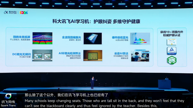 刘庆峰还重点介绍了AI学习机的领先技术。他表示,如今电子屏幕已经成为每个人接触世界的窗口,应该想方设法提升使用过程中的护眼能力。学习机作为孩子学习和探索知识的重要窗口,必须努力守护青少年的用眼健康。