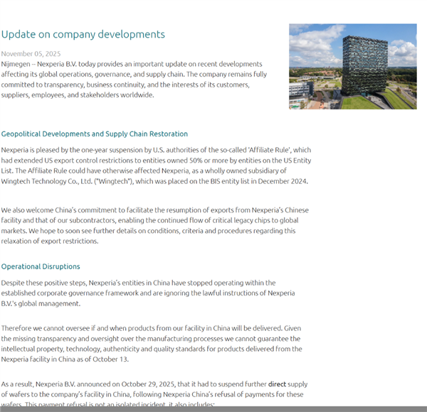 Nexperia声称,我们无法监控中国工厂的产品何时以及是否能够交付。鉴于生产过程缺乏透明度和监管,自10月13日起,我们无法保证从Nexperia中国工厂交付的产品的知识产权、技术、真实性和质量标准。