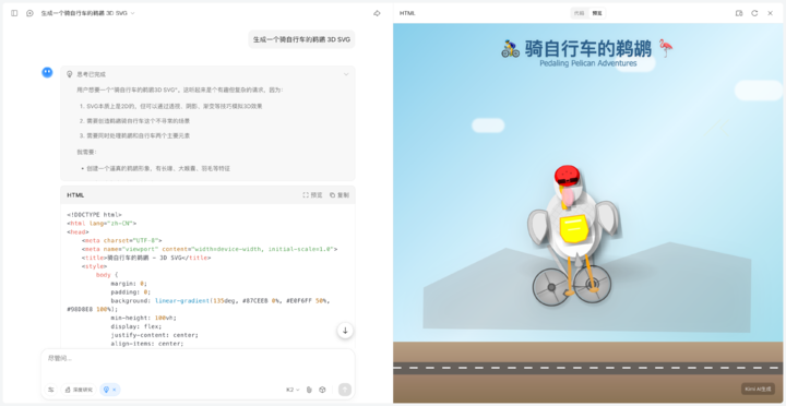 虽然 K2 Thinking 写着推理模型,但是它的推理速度非常快,这段动态的 SVG 代码生成也只花了 1 分钟不到。虽然这个鹈鹕好像有点不太对劲。
