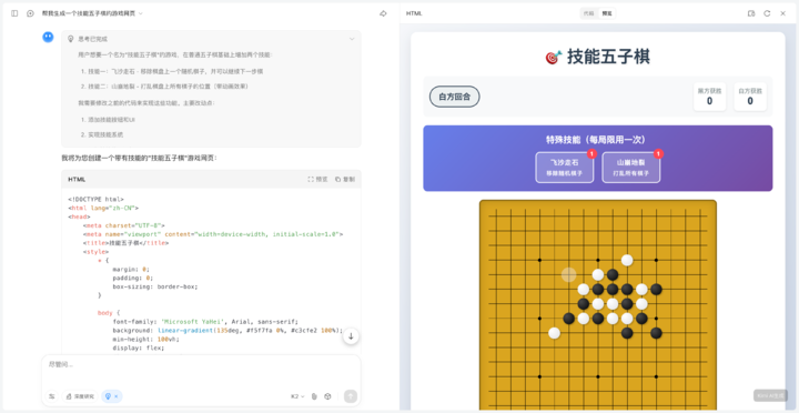 首先是编程任务,我们先让他做了一个技能五子棋的小游戏,要求是在普通的五子棋规则上,玩家可以使用技能。