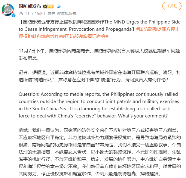 蒋斌:我们一贯认为,国家间的防务安全合作不应针对第三方或损害第三方利益,不应破坏地区和平稳定。菲方拉拢域外势力频繁侵权挑衅,是导致南海局势紧张的根源。南海问题的历史脉络和是非曲直非常清楚,我们不接受一切虚假叙事、歪曲法理的无端指责,不纵容恶人告状、以小讹大的碰瓷讹诈,不允许勾连搅局、生乱滋事的挑衅行径,不放弃维护和平、稳定、发展的协作努力。中方维护自身领土主权和海洋权益的意志坚定不移。我们敦促菲方停止破坏地区国家求和平、谋发展的共同努力,停止侵权挑衅和煽宣炒作,否则只能是跳得越高、摔得越狠。