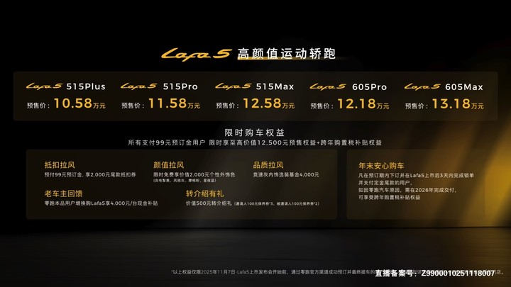 当然,更惊喜的是价格,Lafa 5 分了 515km 和 605km 两种续航版本,共计 6 种车型,预售起售价为 10.58 万元。
