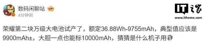 11 月 8 日消息,博主 @数码闲聊站 今日爆料称,荣耀第二块万级大电池试产了,额定 36.88Wh-9755mAh,典型值应该是 9900mAh±,大胆一点也能标 10000mAh。