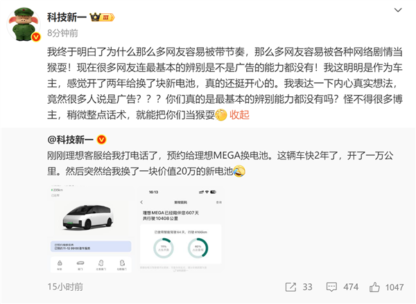 有车主在社交网络上表示:“刚刚理想客服给我打电话了,预约给理想MEGA换电池。这辆车快2年了,开了一万公里。然后突然给我换了一块价值20万的新电池,弄得我还有点不好意思。”