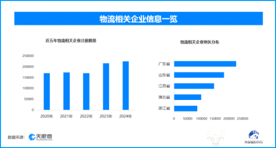 天眼查数据显示,现存物流相关企业171万余家;从地域分布来看,广东、山东、江苏、湖北、浙江、安徽拥有物流相关企业较多。其中,超4成的企业成立时间在1至5年之间。