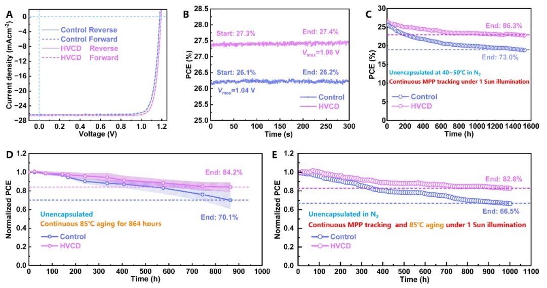 图 2、(A) 参考器件和氯均匀化器件在标准太阳光条件下的电流-电压曲线(正反向测量),(B)参考器件和氯均匀化器件稳态输出效率曲线,(C)参考器件和氯均匀化器件 1529 小时稳态输出效率曲线(40-50℃,1 个太阳光),(D)参考器件和氯均匀化器件在 85℃ 条件下老化的归一化效率变化情况,(E) 参考器件和氯均匀化器件在 1 个标准太阳光和 85℃ 耦合条件稳态输出归一化效率变化情况(用于热稳定性和加速老化测试的器件为非标准工艺制备)。