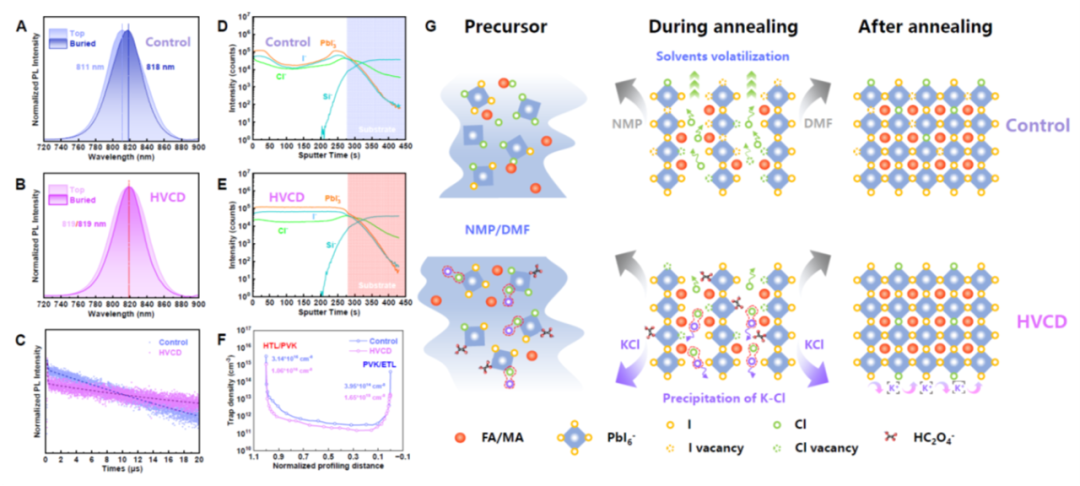 图 1、 (A-B) 氯离子均匀化前后钙钛矿上下表面的光致发光光谱,(C) 氯离子均匀化前后钙钛矿的载流子寿命,(D-E) 均匀化调控前后各离子在垂直方向上的分布情况,(F) 均匀化调控前后钙钛矿薄膜垂直方向上缺陷态密度分布情况,(G) 碱金属草酸盐实现氯离子均匀化分布调控的机理示意图。