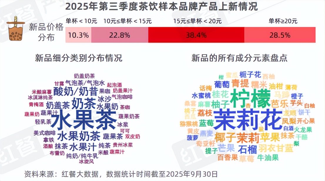 3.茶饮:奶茶类产品上新数量较多,应季水果、花卉成为创新源泉