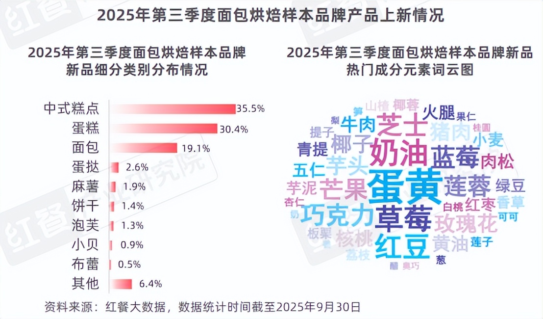 2025年第三季度,在红餐产业研究院监测的面包烘焙品牌中,有40个面包烘焙品牌共推出了1,025款新品。从面包烘焙新品的细分种类来看,中式糕点类的新品数量最多,共推出了364款,占新品总数的35.5%。