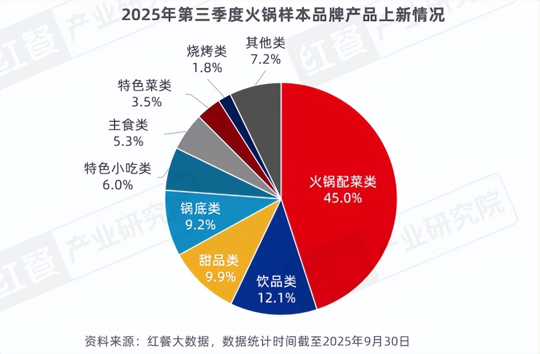 2025年第三季度,红餐产业研究院监测的28个火锅品牌共推出了282款新品,从新品的细分类别来看,当月火锅新品涵盖的类别有火锅配菜类、饮品类、甜品类、锅底类等9种类别。