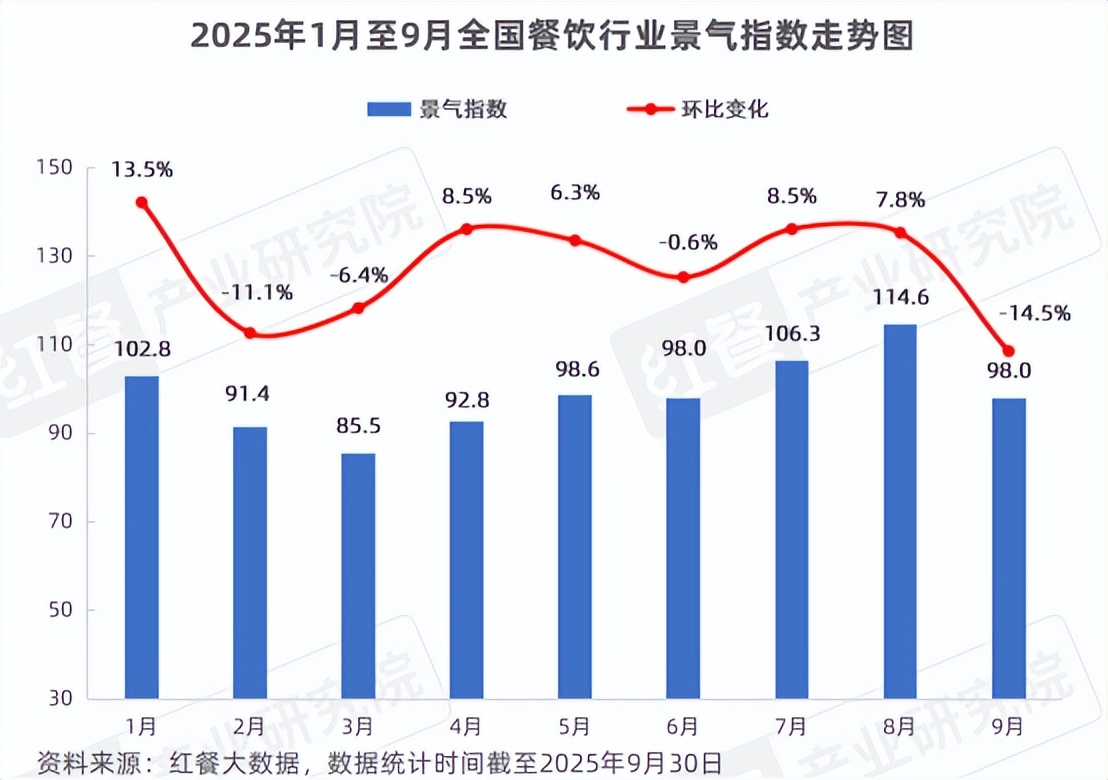 红餐大数据显示,2025年第三季度全国餐饮行业景气指数连续上涨,在经历7月和8月的较大增幅后,于9月回落至98.0,环比降低了14.5%。