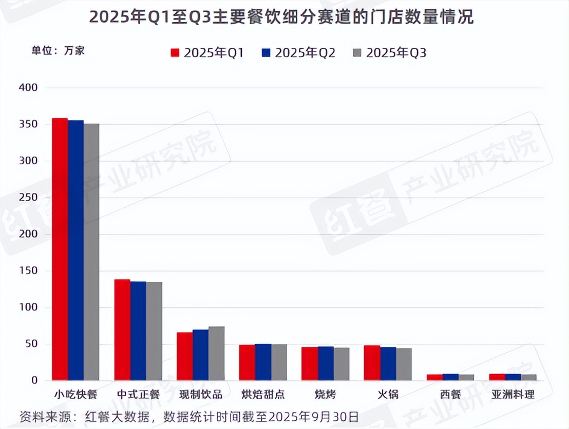 门店数方面,各细分赛道表现各异。红餐大数据显示,从主要细分赛道的门店数量来看,截至2025年第三季度,小吃快餐、中式正餐、现制饮品,这三个赛道分别占据细分赛道门店数量前三,紧随其后的分别是烘焙甜品、烧烤、火锅、西餐和亚洲料理。