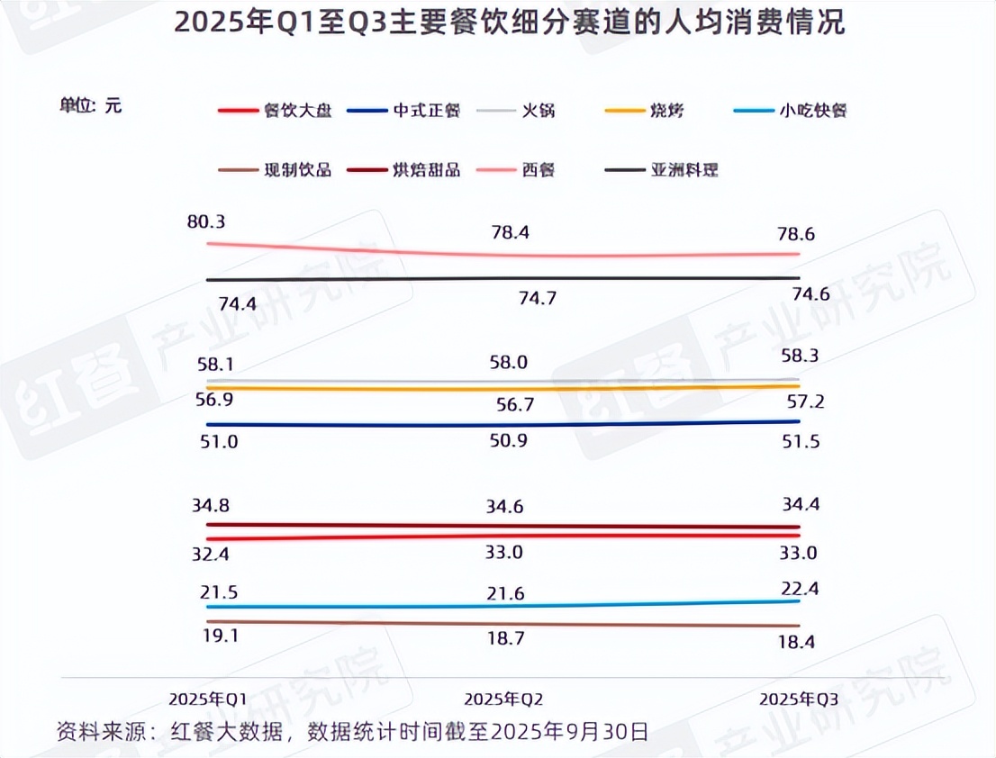 人均消费方面,红餐大数据显示,截至2025年第三季度,餐饮大盘人均消费从第一季度的32.4元微涨至第三季度的33.0元。
