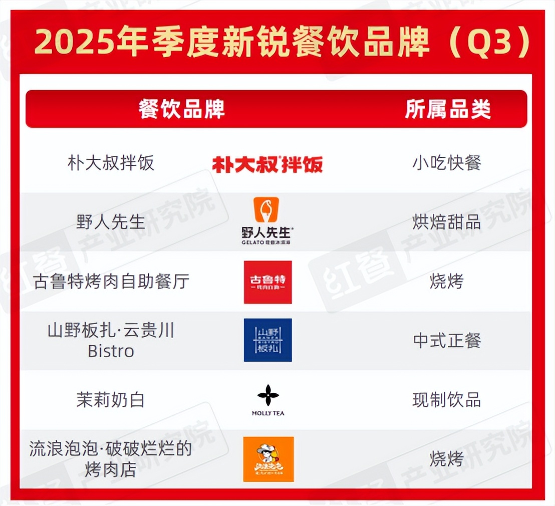 本期季度新锐餐饮品牌聚焦于2025年第三季度在全国范围内表现突出的连锁餐饮品牌,重点关注其在规模扩张、品牌营销、产品创新与差异化定位等方面的优秀举措,经综合评估,下图中的6个餐饮品牌最终入围。