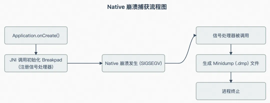 2. 崩溃发生 :当 Native 崩溃发生时,信号处理器会捕获它,并将一个 .dmp (minidump) 文件写入指定目录。
