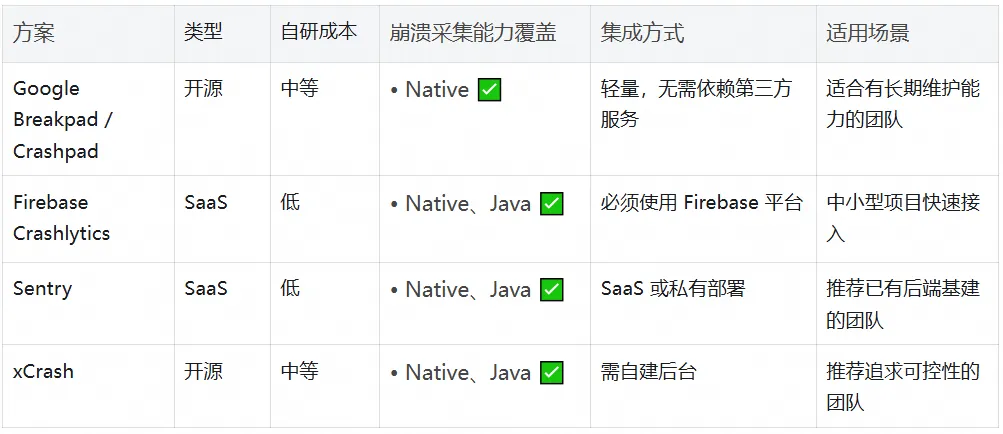 - Google Breakpad/Crashpad:它们是 Native 崩溃捕获的”黄金标准”,提供了从信号捕获、Minidump 生成到后台解析的全套工具链。它们是许多商业方案的技术基石,但自行集成和后台搭建成本较高。