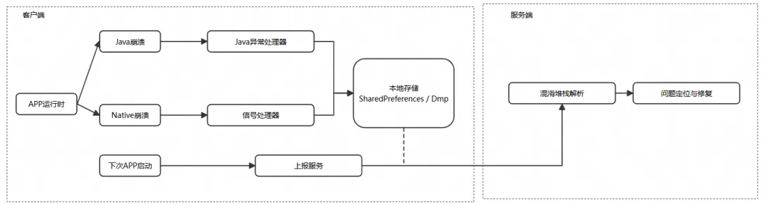 为了全面应对这些挑战,我们设计了一个统一的异常采集方案,遵循”捕获-持久化-上报-解析”的生命周期。无论是 Java 还是 Native 崩溃,客户端的核心任务都是可靠地将现场信息保存到本地。真正的解析和分析工作则交由服务端完成。