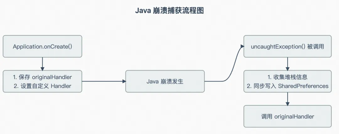 这正是我们捕获 Java 崩溃的入口。通过调用 Thread.setDefaultUncaughtExceptionHandler(),我们可以注册一个全局处理器。当任何线程发生未捕获异常时,我们的处理器便会接管,从而获得在进程完全死亡前的宝贵时机,用以记录崩溃现场的关键信息。
