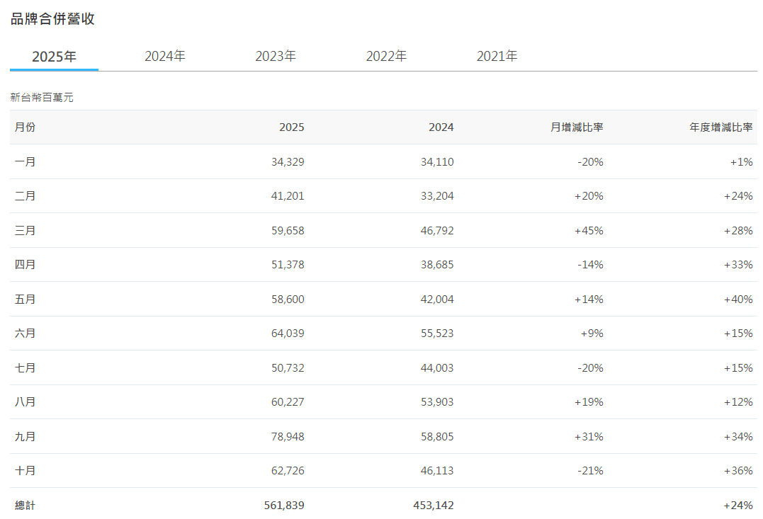 华硕 10 月品牌营收 627.26 亿元新台币,同比增长 36.03%;华硕 2025 年迄今品牌累计营收为 5618.29 亿元新台币(现汇率约合 1291.08 亿元人民币),同比增长 23.99%。