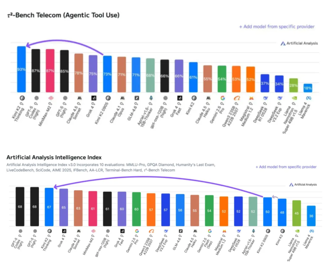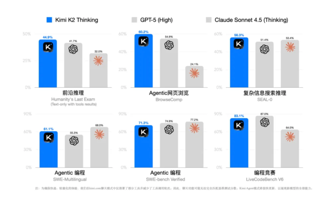 Kimi K2 Thinking在TAU-Bench测试中以78.3分登顶,超过GPT-5(72.1)和Claude 4.5(69.8)。