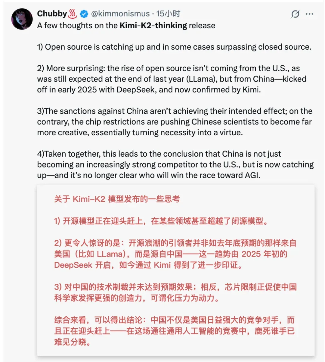 海外的开源社区和科技媒体上,开发者对Kimi K2 Thinking的赞誉也纷至沓来。