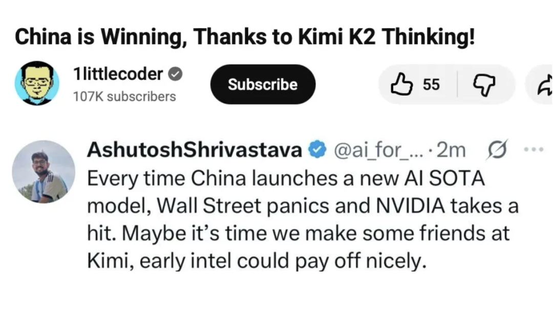 巧合的是,Kimi K2 Thinking发布当天,英伟达股价一路下跌,市值蒸发超1800亿美元。有网友调侃,“每当中国发布先进模型,总能给华尔街带来亿点点震撼”。