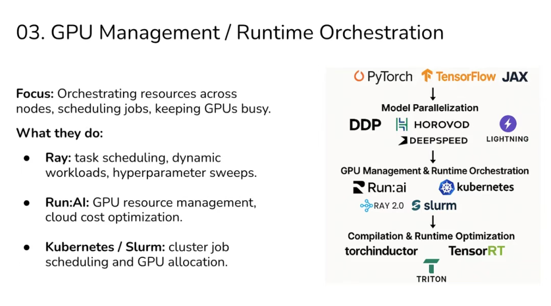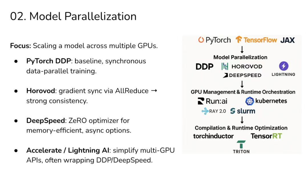 - 如果在并行化层(Parallelization)同步配置错误,就会导致运行时编排层(Runtime Orchestration)GPU 大量闲置。