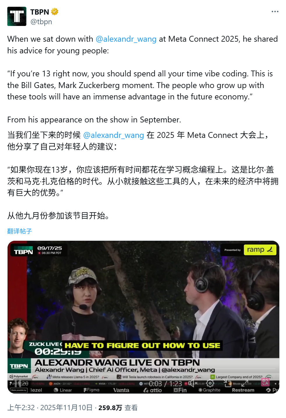 IT之家 11 月 12 日消息,科技媒体 thehansindia 昨日(11 月 11 日)发布博文,报道称 Meta 首席 AI 官汪滔(Alexandr Wang)提出当前 AI 热潮是属于年轻一代的“新比尔・盖茨时刻”。他敦促青少年投入大量时间进行“氛围式编程”(vibe-coding),即通过动手实践和反复试验来掌握 AI 工具。