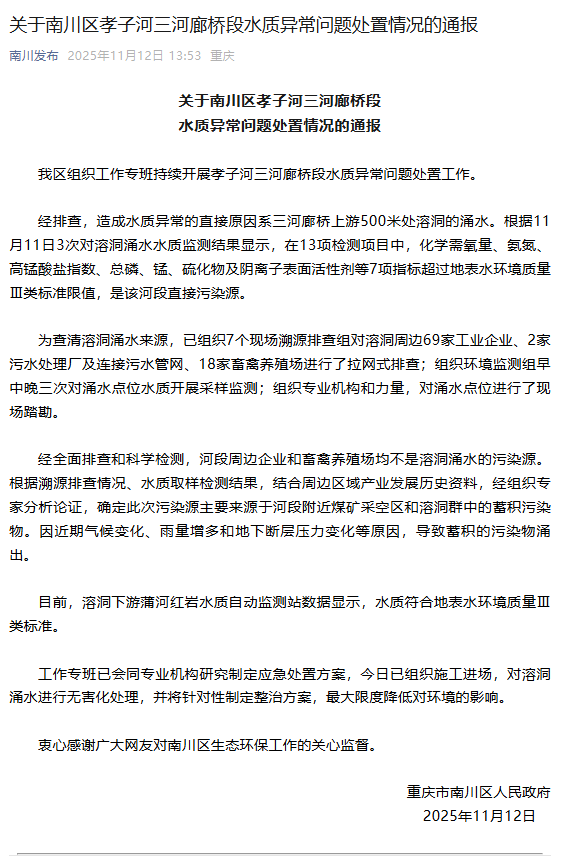 新京报讯 11月12日,重庆市南川区人民政府发布关于南川区孝子河三河廊桥段水质异常问题处置情况的通报。全文如下: