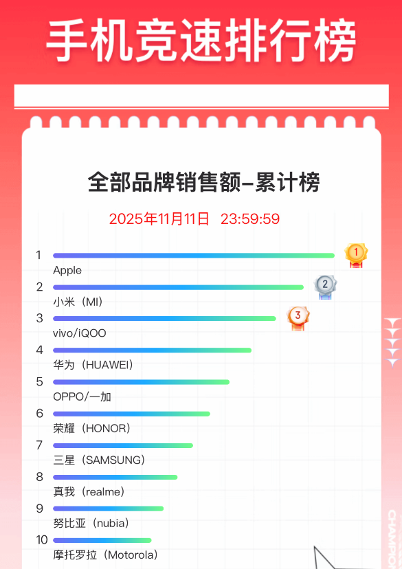 截至11月11日23:59:59,苹果、小米、vivo位列销量榜前三,这也算与大家原本的预期相符。
