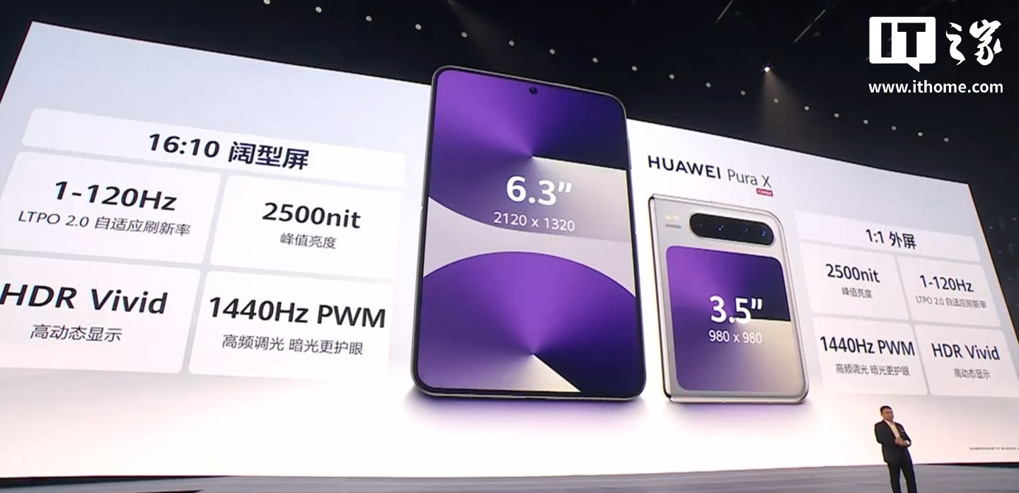 博主所指的「阔屏直板机」预计指类似华为 Pura X 屏幕比例的手机,后者发布于今年 3 月 20 日,是首款全面搭载 HarmonyOS 5 系统的手机,同时配备了一块分辨率为 2120×1320 的 6.3 英寸 16:10 阔型屏,支持 1~120Hz LTPO 2.0 自适应刷新率、HDR Vivid、1440Hz PWM 调光。