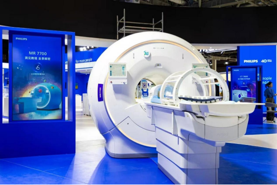 举例来说,在院内诊疗领域,今年的重磅展品MR7700多核磁共振系统,上个月底刚拿到中国NMPA注册证,便马不停蹄亮相进博会。这款3T临床多核磁共振设备可提供无辐射、无放射性的全维度在体生化代谢图谱,可以探知更多人体疾病代谢通路。