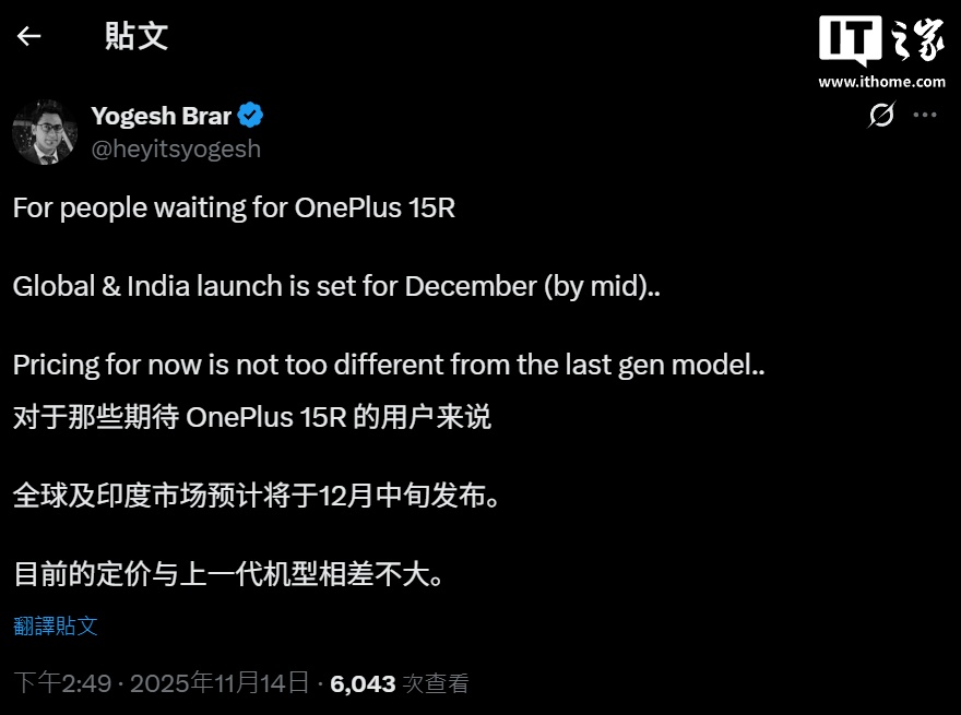IT之家 11 月 14 日消息,消息人士 Yogesh Brar 今天在 X 平台透露,一加 15R 手机将在 12 月中旬发布,预计登陆印度及全球市场,售价与现款一加 13R 差别不大。