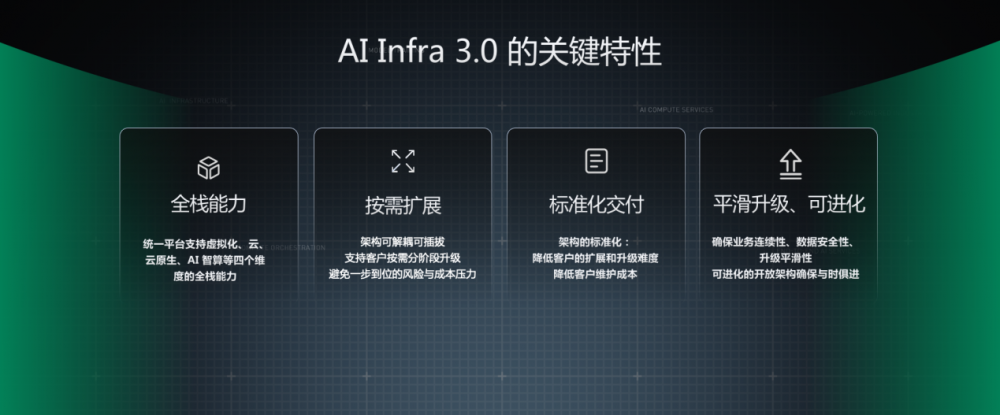 林源强调,在这四层能力的支撑之下,AI Infra 3.0具备一些关键特性。包括覆盖虚拟化、云、云原生、AI智算的全栈能力;能力可解耦、可插拔,支持分阶段升级的按需扩展;基于架构的标准化,降低扩展升级难度与运维成本;开放的底座确保能力能持续演进,满足未来需求。