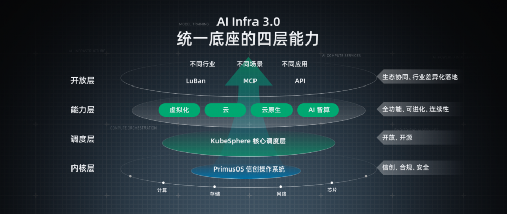 据了解,AI Infra 3.0由四层统一架构组成,分别为最底层的内核层——由青云科技自研的PrimusOS信创操作系统,确保与国产芯片等硬件的深度适配、合规安全与极致性能;调度层——以开源开放的KubeSphere容器平台企业版为统一调度底座,实现通算、超算、智算的统一调度与资源最优分配;能力层——在统一平台上,提供虚拟化、全栈云、云原生、AI智算的全栈能力,支撑客户业务随IT架构逐步演进;开放层——通过KubeSphere LuBan开放平台、100%开放API、兼容MCP等协议,支持生态对接与行业“最后一公里”的差异化定制。