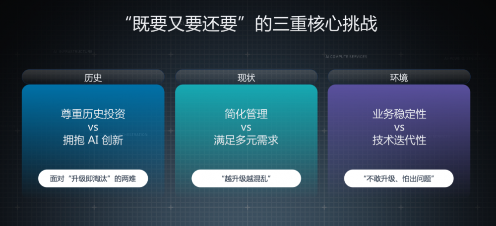 第一是既要尊重历史IT投资(传统IT、虚拟化、云原生、信创),又要拥抱颠覆性的AI创新,担心“升级即淘汰”;第二是IT团队追求简化稳定,业务部门因市场竞争需求多元,导致IT支持越深入,系统越复杂;第三是企业既要满足技术快速迭代,又要确保业务绝对稳定,导致团队不敢升级,惧怕风险。