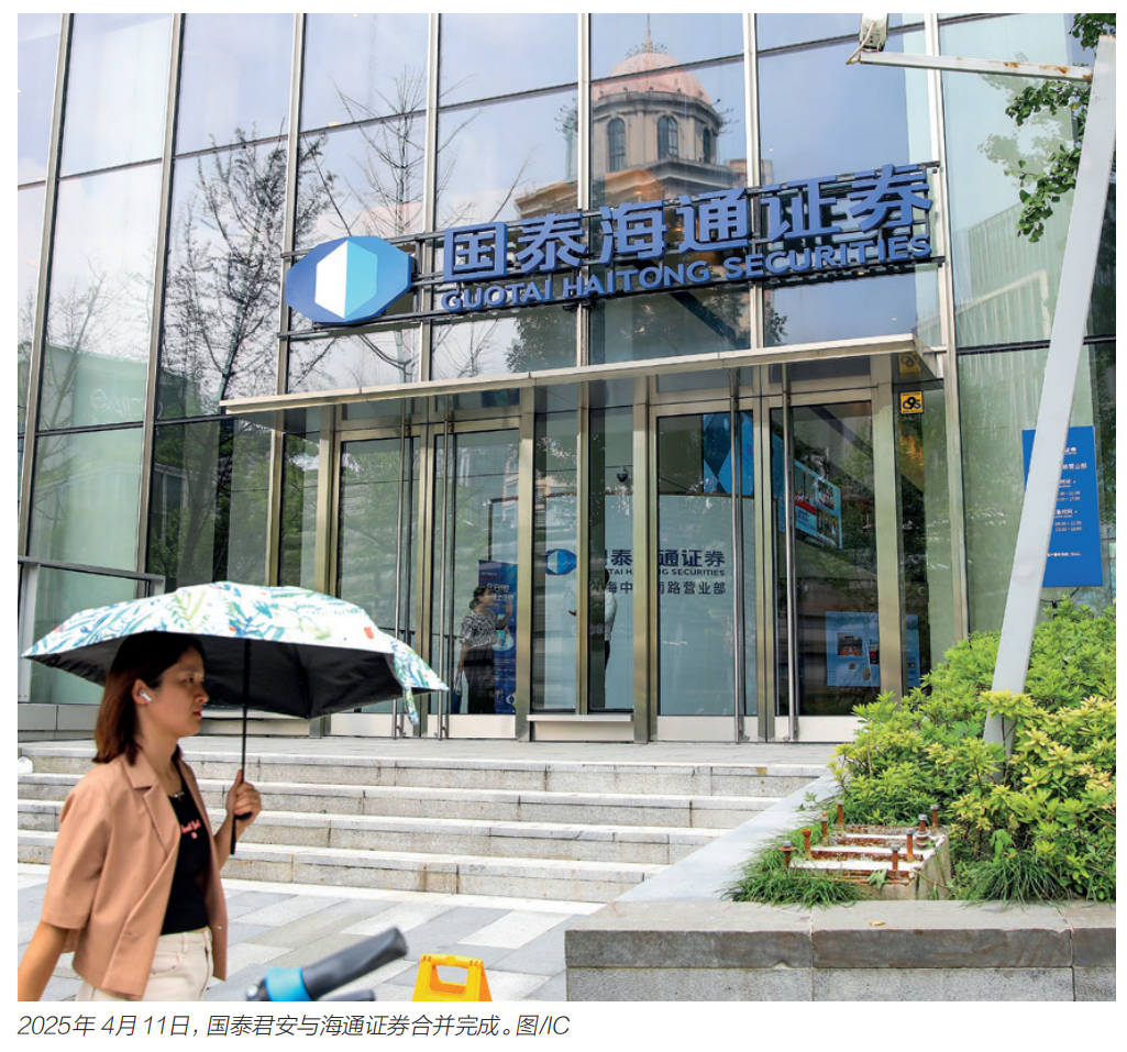 最具代表性的案例为国泰君安与海通证券两家上海本地头部券商之间的合并。2024年9月5日,双方公告筹划重大资产重组;2025年1月17日,证监会正式核准;4月11日,合并正式完成,国泰君安更名为国泰海通证券。合并后,国泰海通的总资产、营收、净利润等各项数据紧追中信证券。