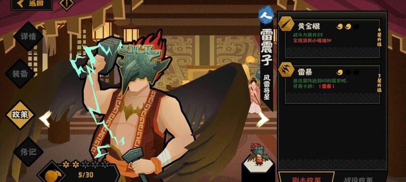 让妲己担任主城太守,初期将主城建筑转为商业,借此对其他国家施加腐败状态,以解锁雷震子的技能牌。但实际测试发现效果不佳,整体表现不及刑天稳定实用,辅助作用有限。