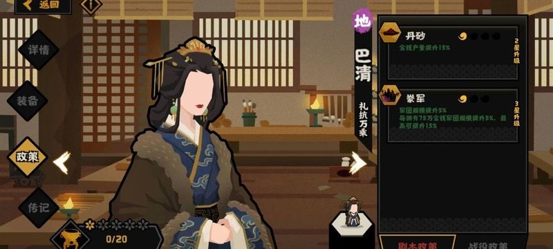 巴清的玩法十分直接,依靠金钱收益和扩大军团规模。前期拥有更大军团可正面硬撼秦楚汉剧本中的秦国,战损维持在20至35之间,相对可控。