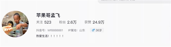 据了解,苹果哥名叫孟飞,其抖音账号叫“苹果哥孟飞”,目前积累的粉丝数是2.6万,获赞24.9万。
