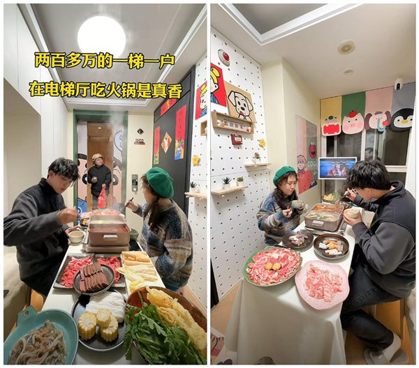 据了解,该博主所在的小区是一梯一户,她将电梯厅布置成了多功能区域,不仅可以观影,还能涮火锅。