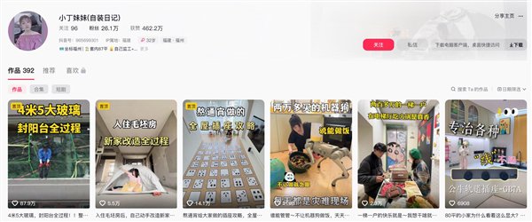 截至目前,小丁妹妹的抖音粉丝数是26.1万,获赞462.2万,她目前在福州,房子套内面积是87平,个人账号主要介绍的是房子装修内容。