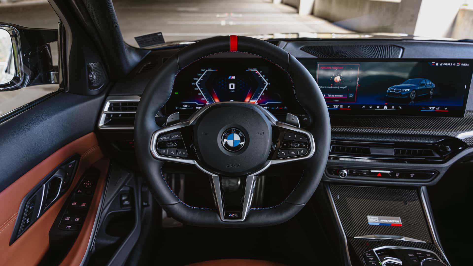 外观颜色同时决定制动卡钳涂装,分别为红色或蓝色。标配的 Shadowline Package 带来自适应 LED 大灯以及深色格栅和下进气口细节。M340i 50 Jahre Edition 还追加 M Performance 碳纤维行李厢扰流板、19 英寸 M 双辐轮圈、M Performance 排气尾段,并在车尾加入额外的“50 Jahre Edition”标识。