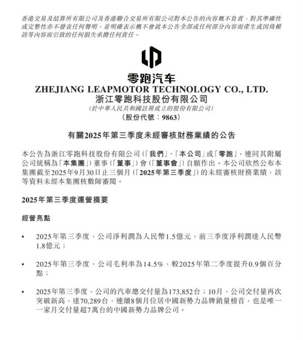 财报显示:2025年第三季度,零跑汽车总收入为194.5亿元,同比增长97.3%;净利润为1.5亿元,已连续实现季度盈利。